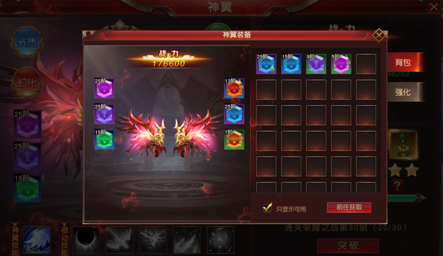 当玩家的角色等级达到指定级数后,还可以增加翅膀的装备符石的收集和养成,通过野外战斗玩家可以获得大量不同等阶的翅膀装备符石,翅膀装备的符石越高阶,提升的属性和战力越强。
